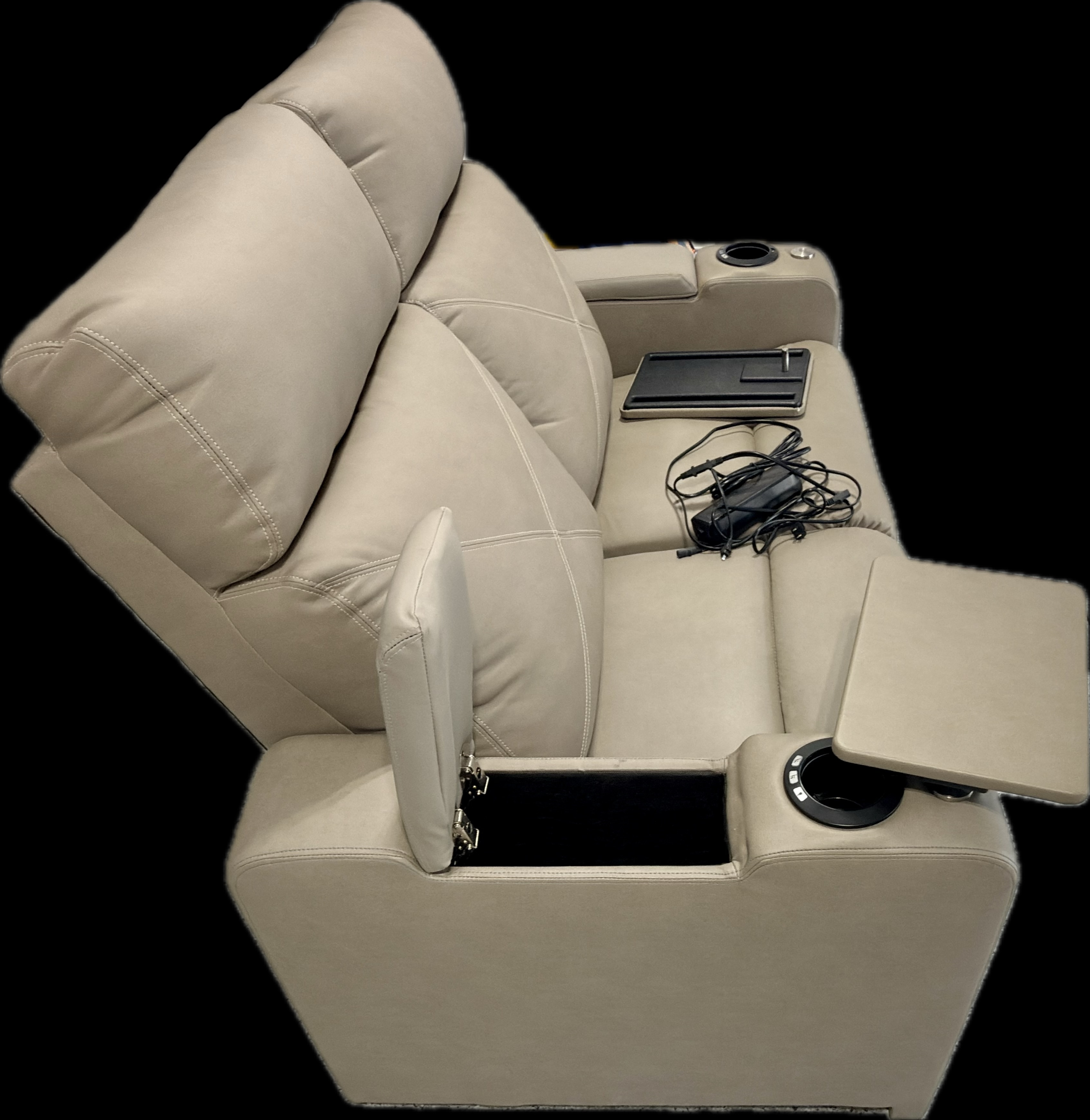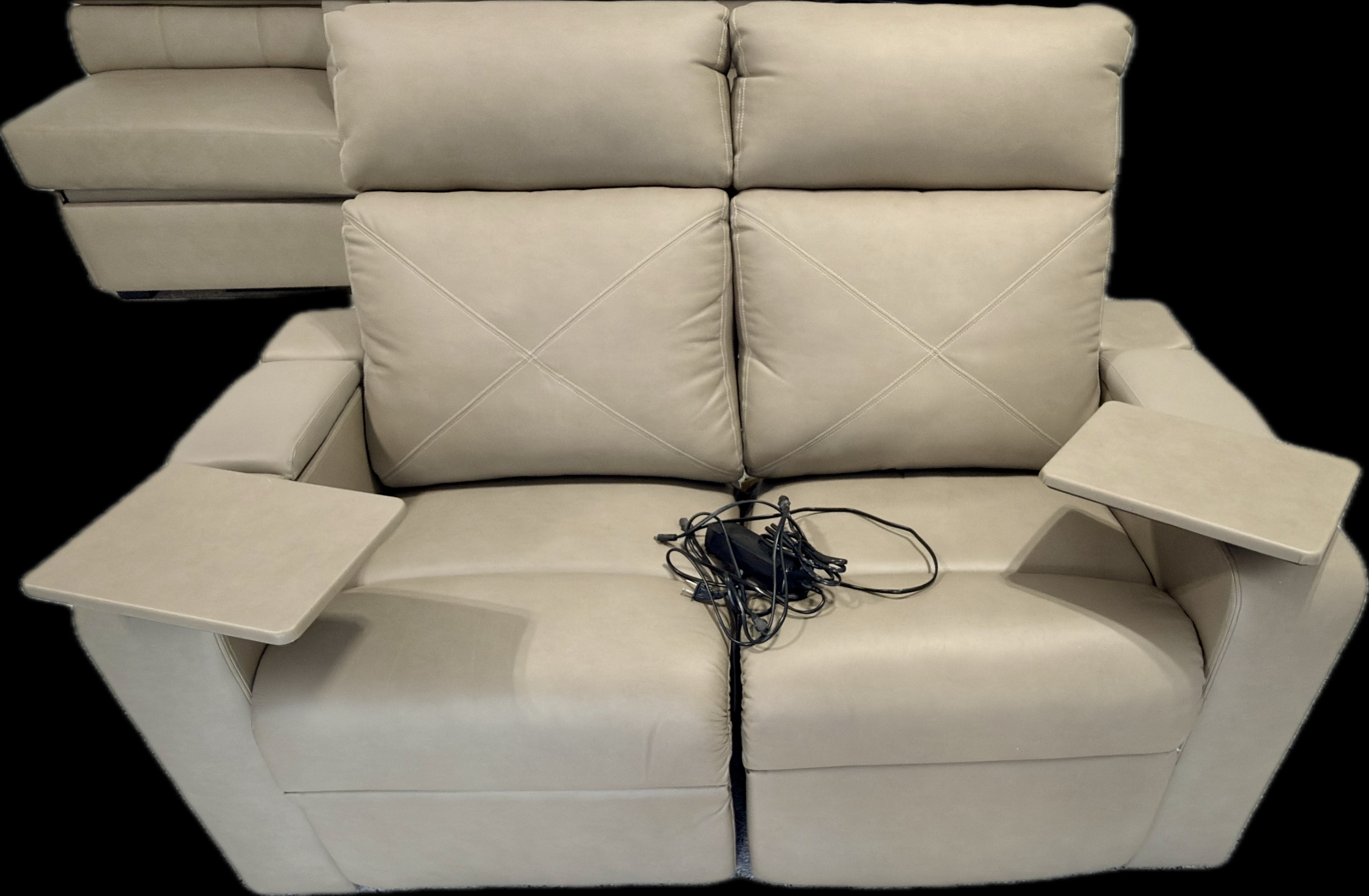 1. SET #1, Two power recliners with built-in charging stations, and accessory table for each. Storage pocket beneath each arm rest. Both chair backs were replaced in 2024, and one spare chair back is also included.